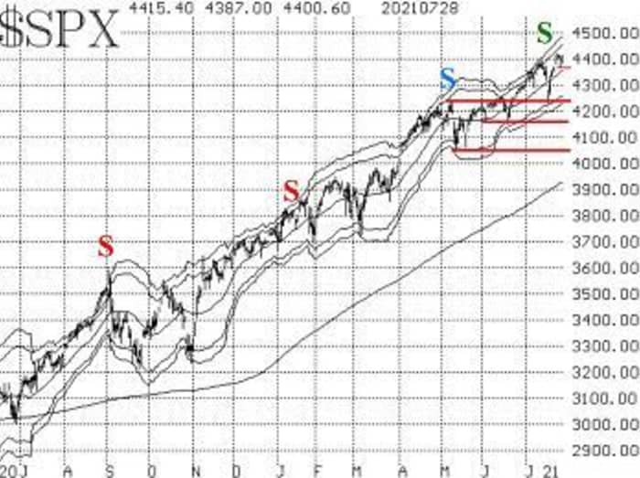 The SPX chart is still in a bullish mode, as it is rising and above support. There is minor support at this week’s lows, near 4370. Then there is more important support below that at 4233 (the July lows). As long as SPX remains above that level, the chart will still have a bullish appearance. Further support levels at 4160 and 4060 were well-tested, but are so far below current levels as to be of little use.