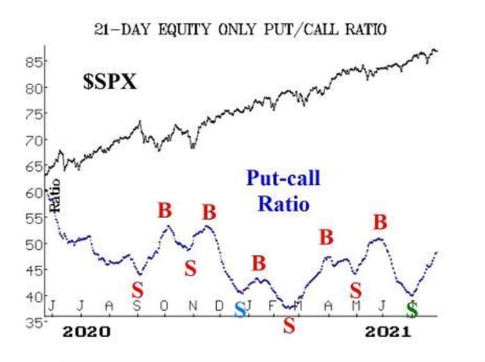 As noted on the accompanying SPX chart, a McMillan Volatility Band (MVB) sell signal is place (green “S” on the upper right of the chart). In addition, there is now a realized volatility sell signal in place, too, as the S&P’s 20-day historical volatility has risen above 11%.