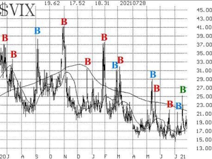 The one area of the market that has not shown these negative tendencies is implied volatility – VIX VIX, -3.33% and its trading products. The VIX “spike peak” buy signal of July 20 is still in place. In fact, there has been a continuous “spike peak” buy signal in place since May 21, except for two trading days. Moreover, the trend of VIX remains downward as the 200-day moving average is still declining, and it is well above the VIX 20-day moving average.