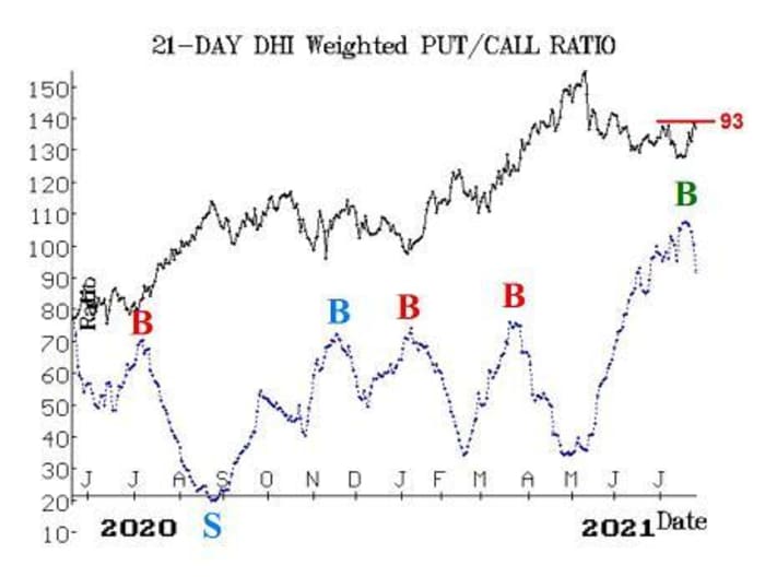 D.R. Horton DHI, +4.62% has a new buy signal from its put-call ratio chart, but we want that to be confirmed by an upside breakout as well. From the chart below, one can see the local maximum at an extremely high level on the put-call ratio chart (the green “B”), and that is an example of extreme pessimism toward this stock, even though its pullback since the beginning of May has not been all that steep.